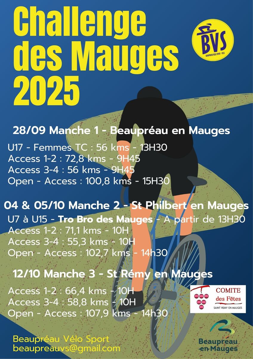 Le Bvs avec la ville de Beaupreau en Mauges la commune déléguée de St Philbert en Mauges, la petite Reine Philbertaine, le comité des Fêtes de St Rémy en Mauges et la municipalité de Montrevault sur Evre commune de St Rémy en Mauges organisent une nouvelle édition du Challenge des Mauges.