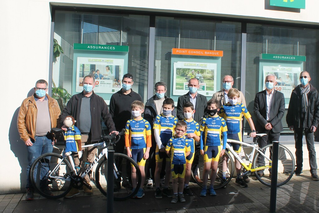 C'est avec joie que quelques jeunes coureurs de l'école de vélo accompagnés des éducateurs du Club ont reçu les nouvelles tenues Jaunes et Bleues, remises par les représentants de Groupama.