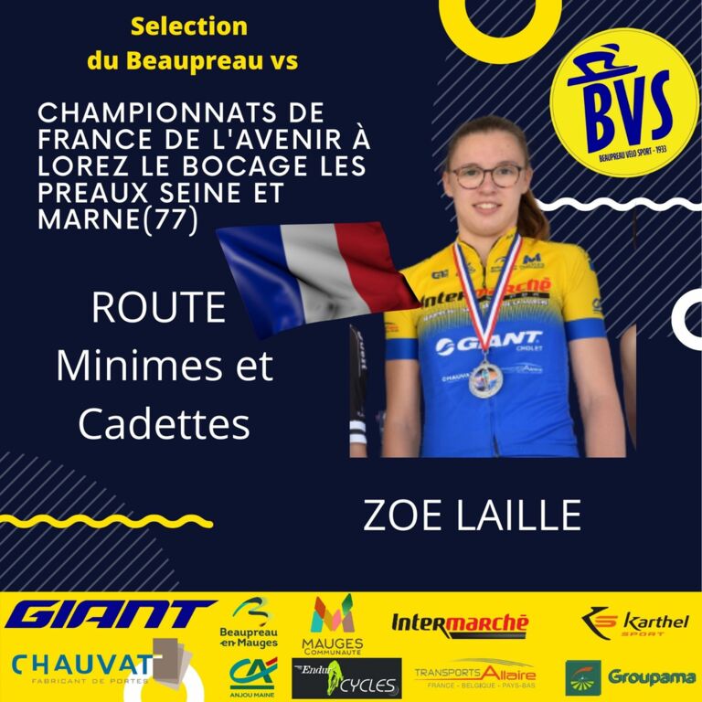 Le Beaupreau velo sport est fier de vous annoncer que Zoé Laillé notre cadette va participer avec la sélection des Pays de la loire ce jeudi 29 Juillet à Lorrez-Le Bocage- les préaux en Seine et Marne (77) aux championnats de France