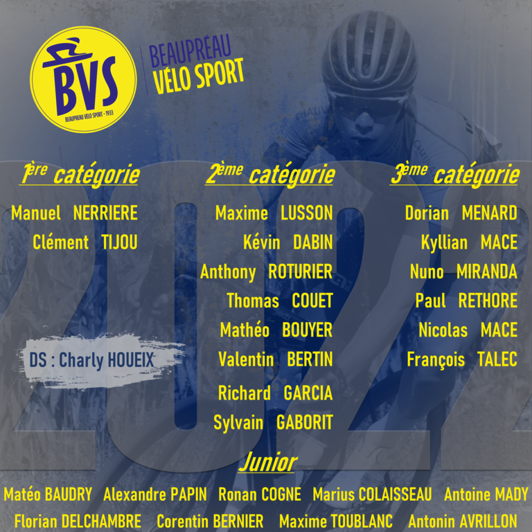En Juniors : 9 coureurs composeront notre équipe Juniors garçon 2022 : Antonin Avrillon, Matéo Baudry, Corentin Bernier, Ronan Cogné, Marius Colaisseau, Florian Delchambre, Antoine Mady, Alexandre Papin, Maxime Toublanc.